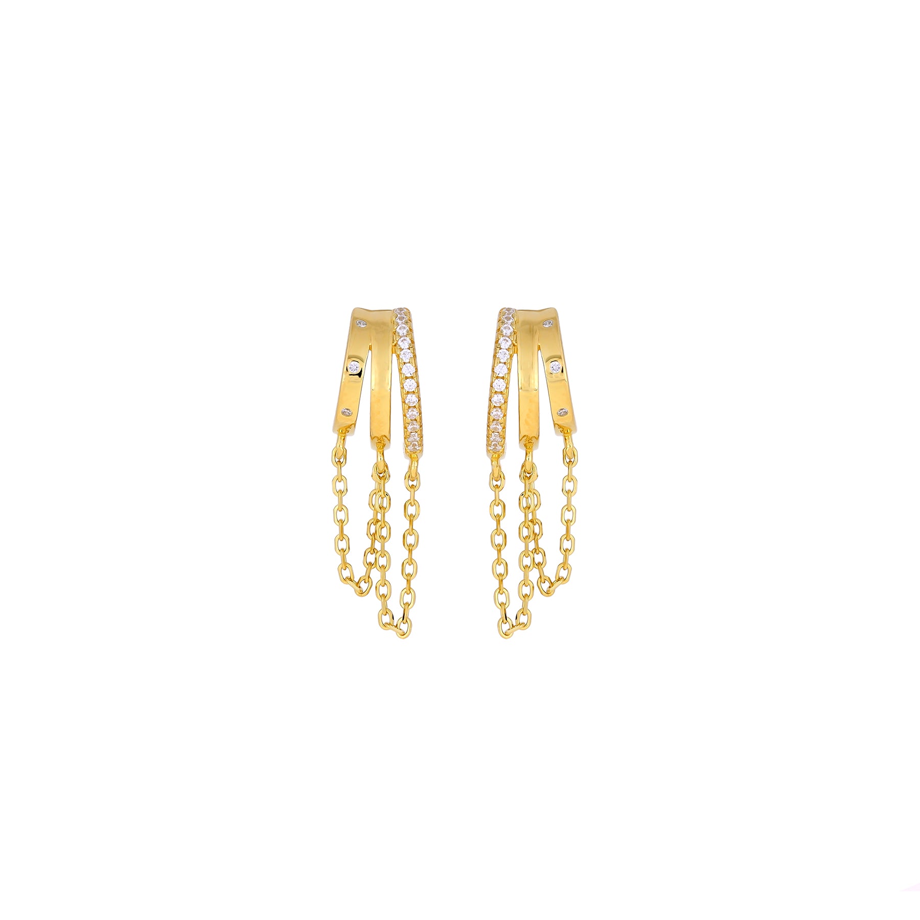 Gold vermeil hoop earrings with dangling chains.