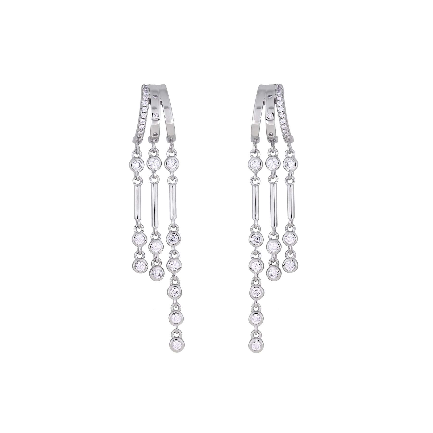 Sterling silver hoop earrings with chains of bezel set cubic zirconia.