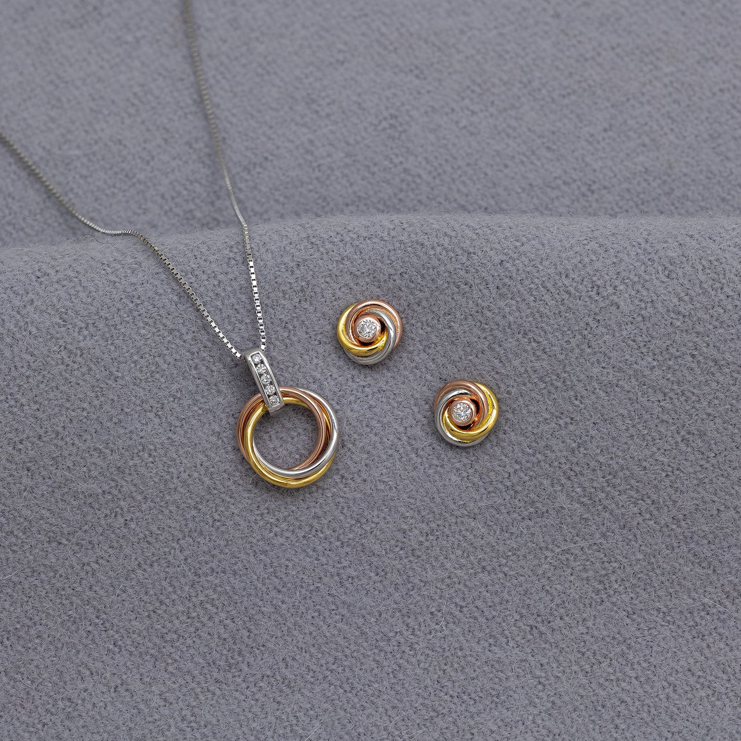 Three complete circles intertwine to create never-ending love-knots. The knots of sterling silver and gold vermeil are each set with a bright and sparkling lab grown diamond. The total diamond weight of the earrings is 0.13 carats.