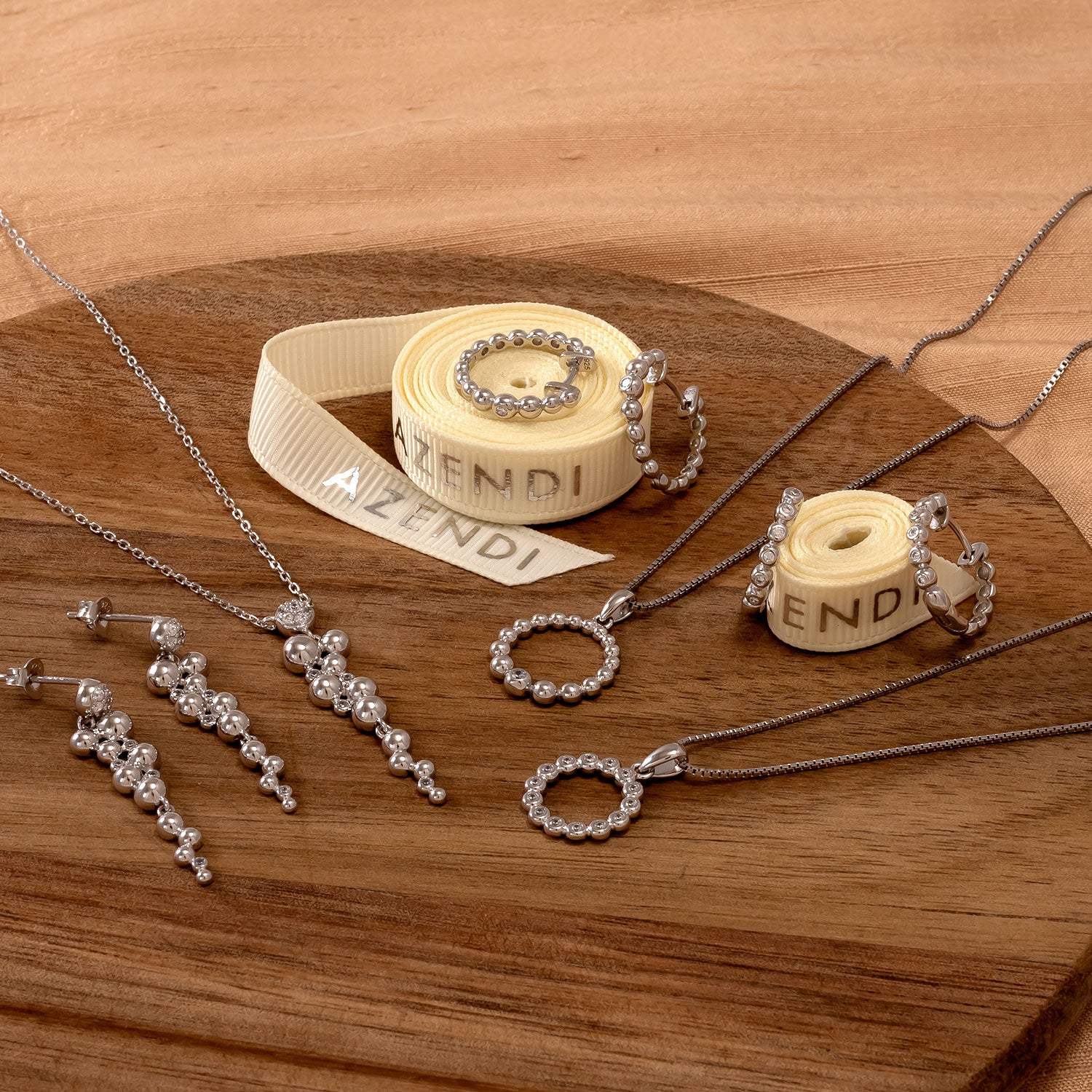 Every purchase from Azendi can receive our complimentary gift wrap service, where your jewellery will be carefully enveloped in beautiful silver paper and finished with a hand-tied grosgrain ribbon bow.