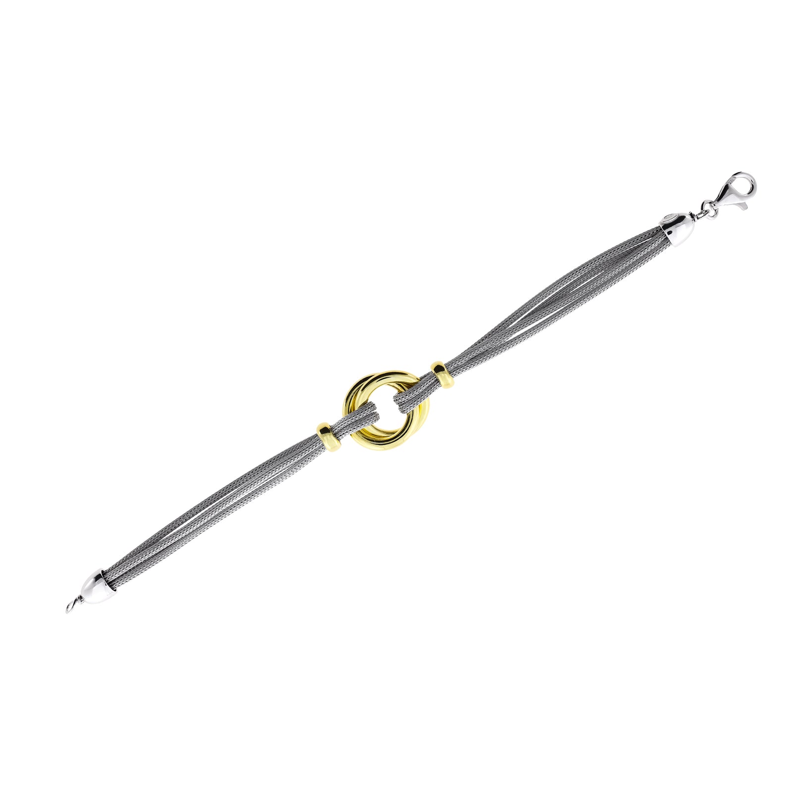Two polished circles finished with rose gold vermeil interlock and are suspended from double strands of woven sterling silver mesh chain to create these dramatic earrings. The design allows the earring to have movement when you are wearing them.