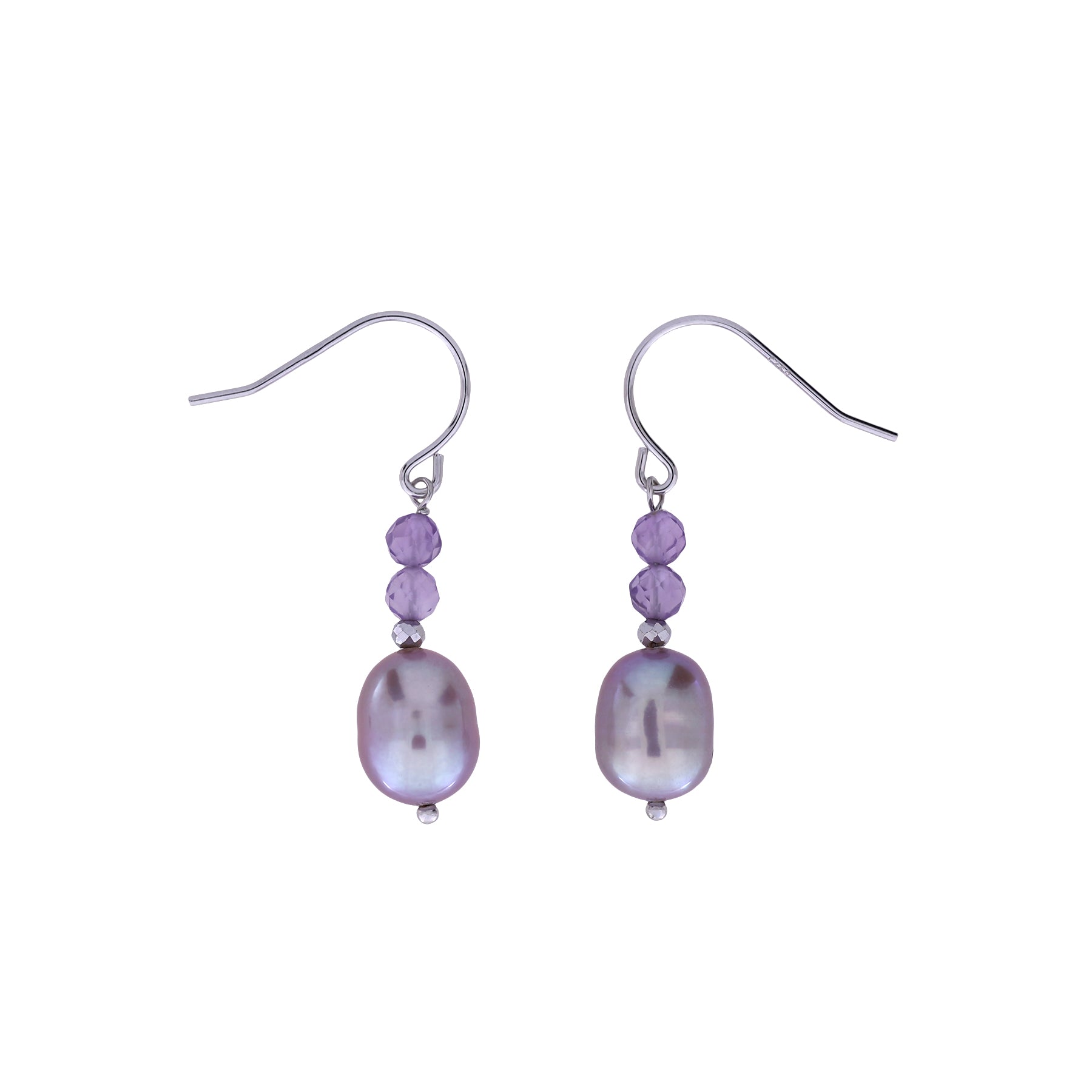 Pink oval pearls sit at the bottom of these pretty drop earrings, suspended beneath sparkling hematite and faceted amethyst gemstones.