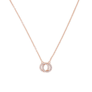 The interlocking circles of rose gold vermeil in this necklace are embellished with pavé cubic zirconia stones. The high quality, fully faceted stones allow the jewellery to catch the light and create an endless sparkle.