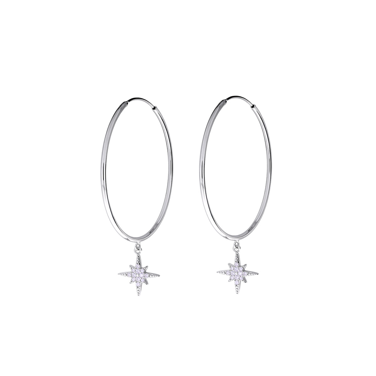 Polished sterling silver flexible hoops are embellished with dangling stone-set eight point star charms.