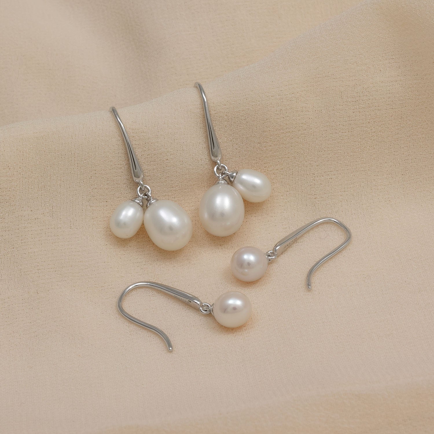 These drop earrings feature single round freshwater pearls on simple polished hooks.