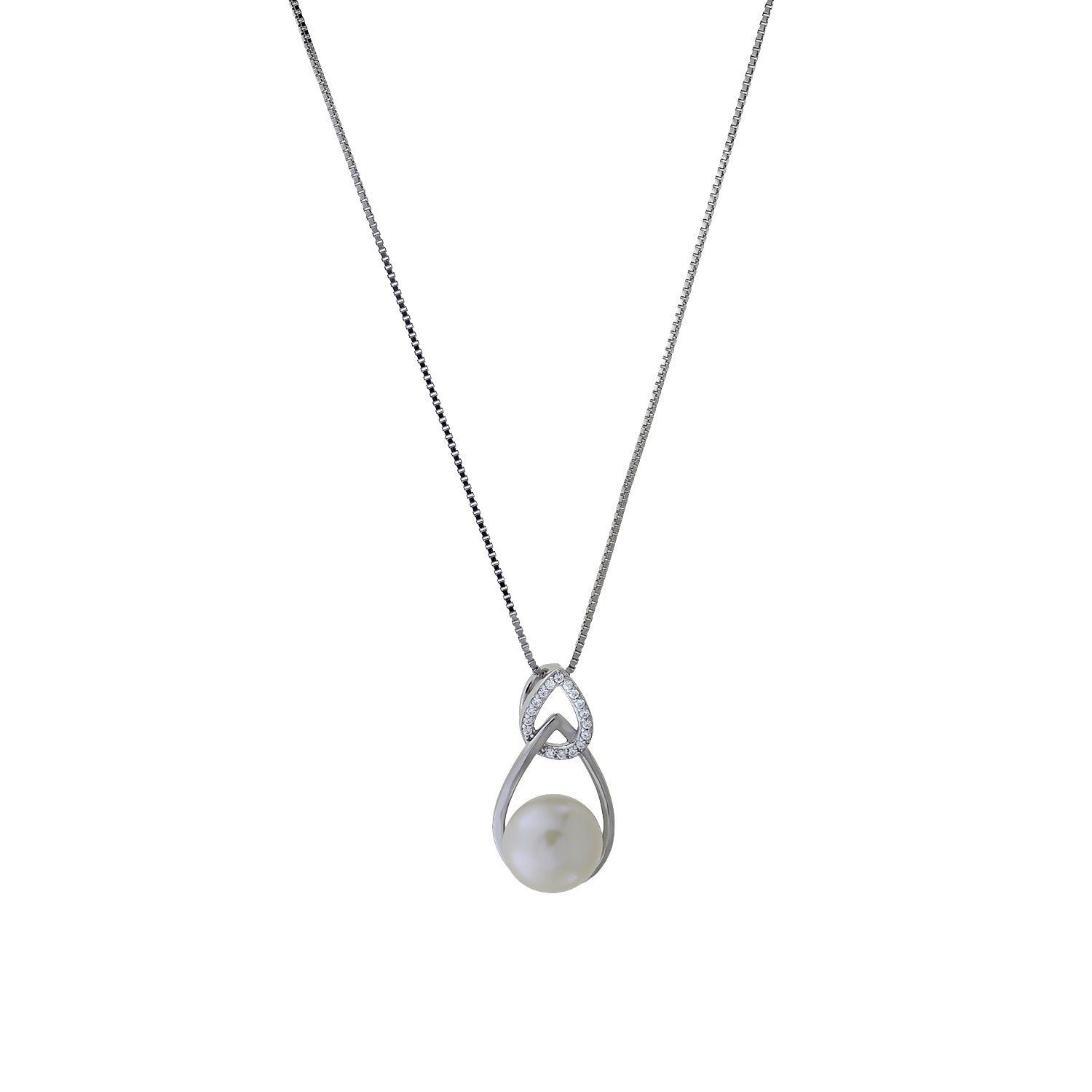 This pretty pendant features interlocking teardrops in sterling silver. The upper teardrop is set with bright sparkling cubic zirconia, while the lower teardrop surrounds a striking iridescent freshwater pearl.