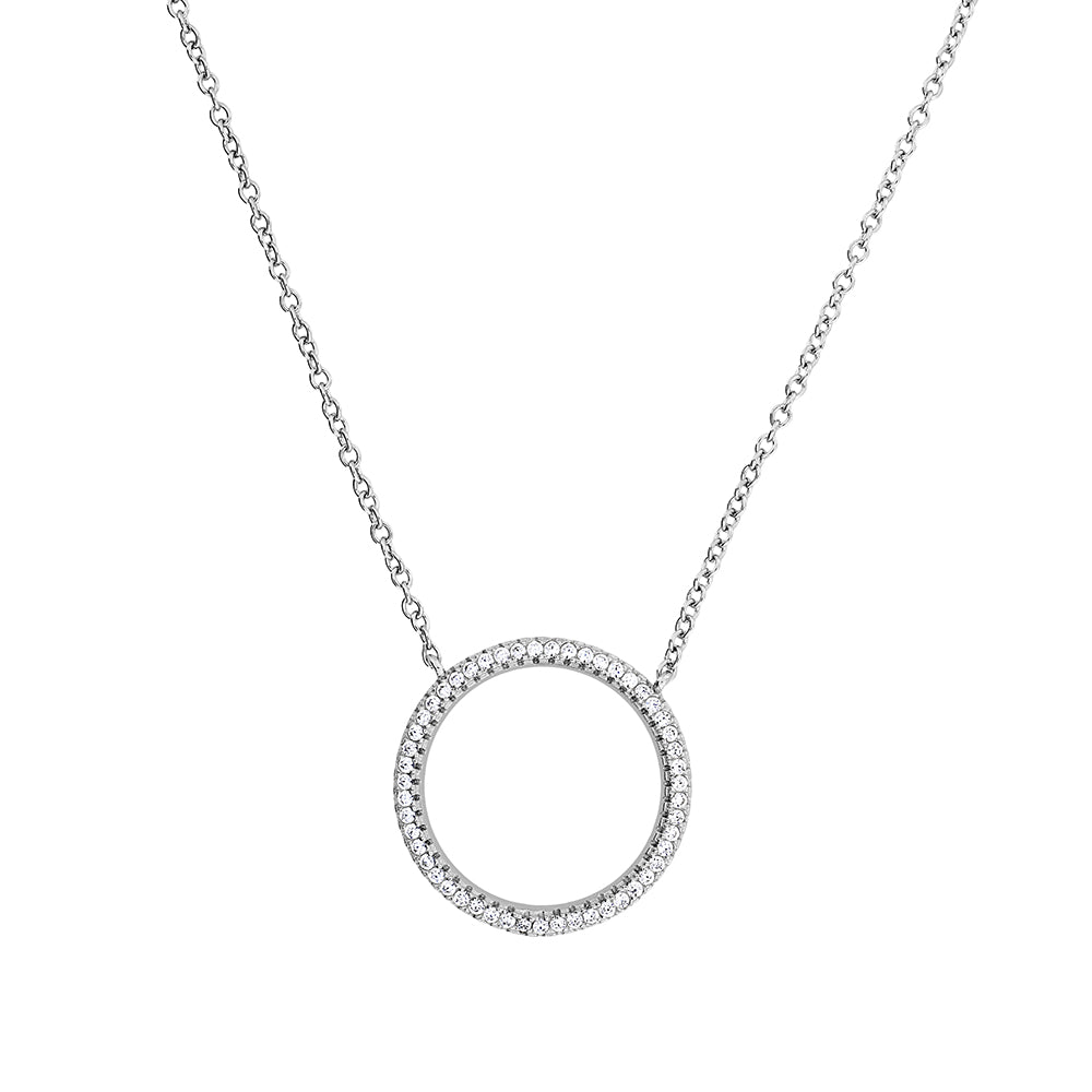 This simple but stunning necklace is formed from polished sterling silver, intricately set with a sparkling rainbow of pavé cubic zirconia.