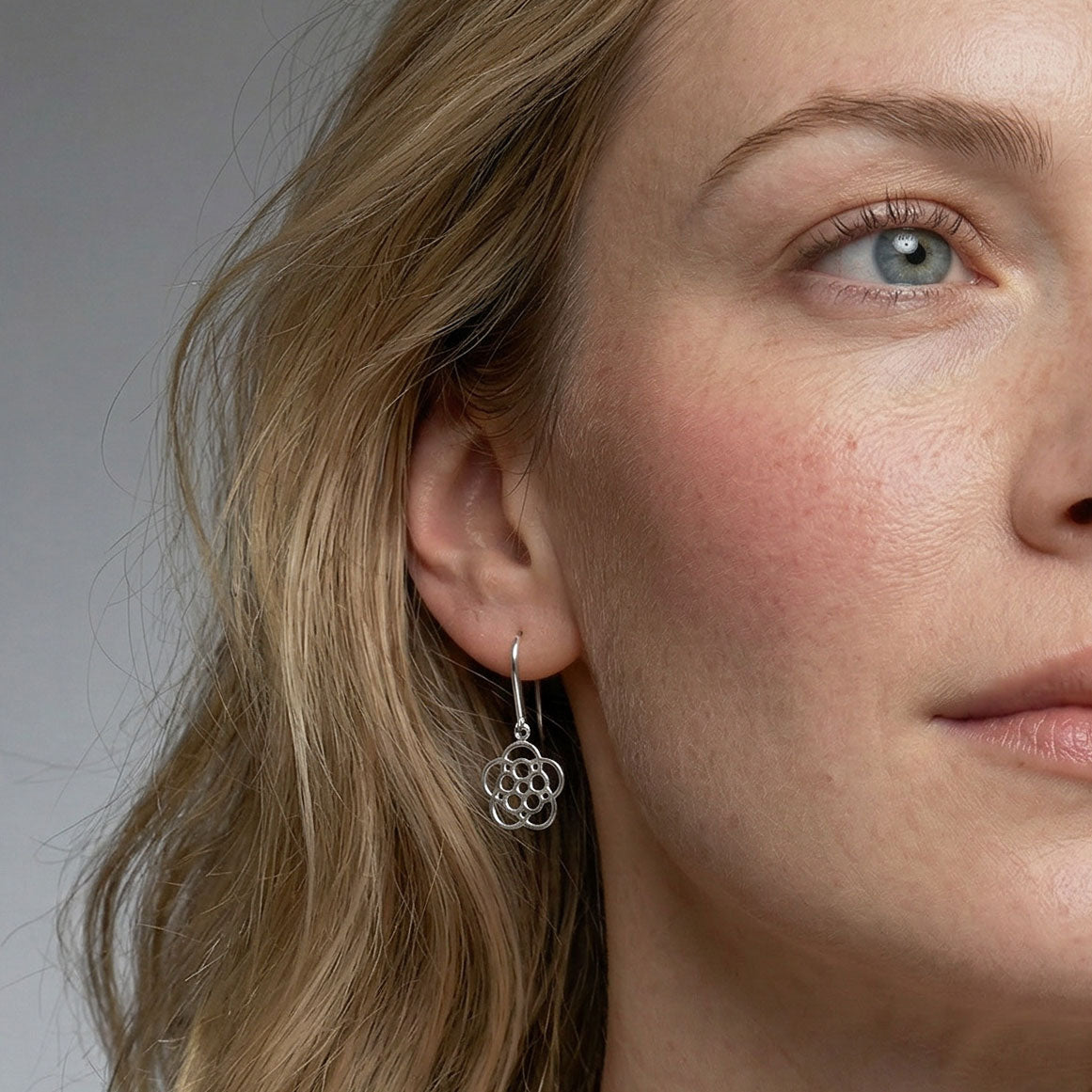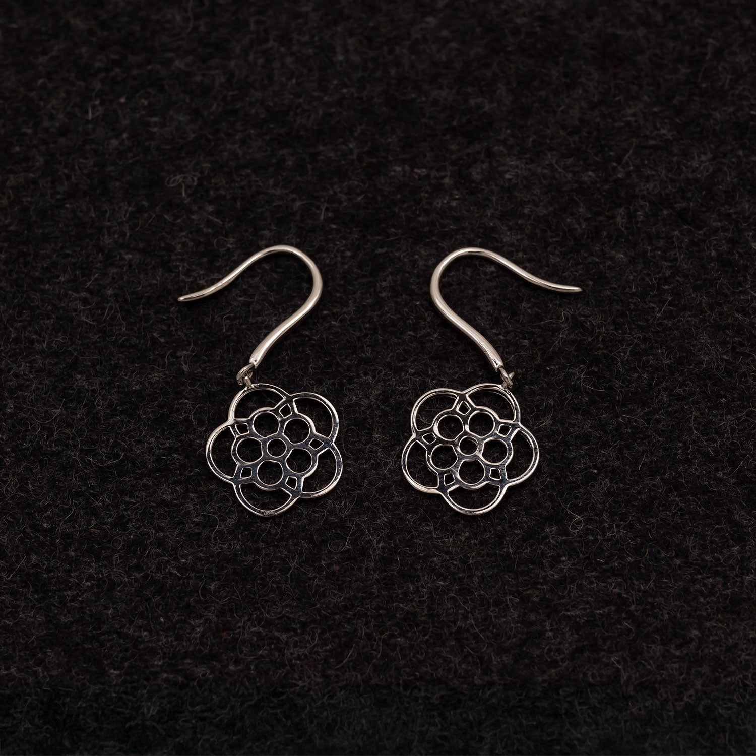 Sterling silver stylised Yorkshire Rose drop earrings.