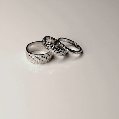 This simple sterling silver ring features a polished hammered design. The ring is a court shape, which means that it is curved inside for a comfortable fit. Available in three different widths, this silver ring looks great when stacked together with other rings from the Elements collection.